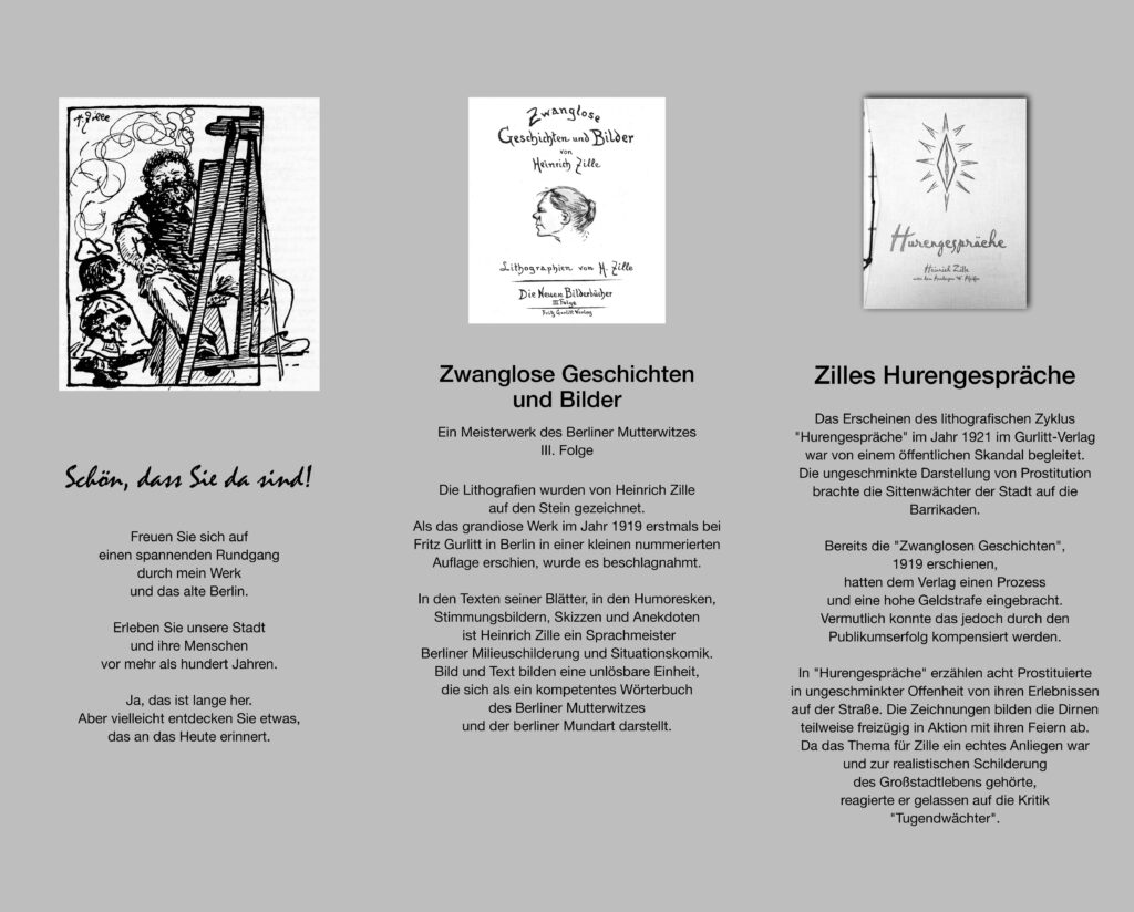Derzeit zeigen wir Ihnen die Dauerausstellung „Heinrich Zille erwartet Sie“, die Foto-Ausstellung „Zeitreise Zille“ und in unserem Kabinett „Erotisches vom Meister“ Zeichnungen und Bücher zu den von Zille unter dem Pseudonym W. Pfeifer verfassten Zyklus „Hurengespräche“, der bei seinem Erscheinen 1921 umgehend von der preußischen Zensur verboten wurde.